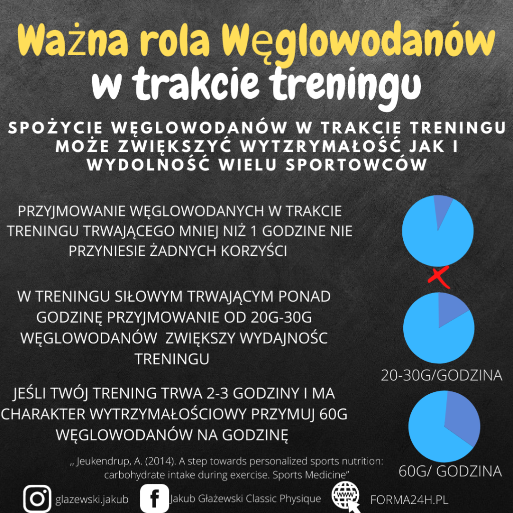 Spożyte węglowodany w trakcie treningu stanowią źródło energii dla pracujących mięśni, a tym samym wspierają zasoby wewnętrzne organizmu. Osoby o różnej aktywności treningu siłowego, w wyniku praktycznej weryfikacji czasu trwania ich wysiłku, powinny dostosować własną zindywidualizowaną ilość węglowodanów potrzebną na odbudowie zasobów energetycznych, która będzie zgodna z jej celami, włączając w to potrzebę nawodnienia organizmu oraz zapewnienie komfortu jelitowego. Aby zatem poprawić swoje zdolności wysiłkowe, a jednocześnie zaspokoić potrzeby żywieniowe i zagwarantować dobrą tolerancję pokarmową, sportowcy podczas wykonywanych ćwiczeń powinni sięgać po odżywki węglowodanowe, które charakteryzują się niską zawartością błonnika pokarmowego oraz łatwością spożycia. Poprzez dostarczanie węglowodanów z zewnątrz w postaci glukozy i fruktozy, oszczędzamy glikogen skumulowany w tkance mięśniowej, tym samym zwiększając zdolność generowania siły i mocy mięśniowej w późniejszych fazach treningu. W odniesieniu do treningu siłowego, praktycznym zaleceniem wydaje się spożycie od 40 do 80g węglowodanów w postaci połączenia glukozy i fruktozy na całą jednostkę treningową.