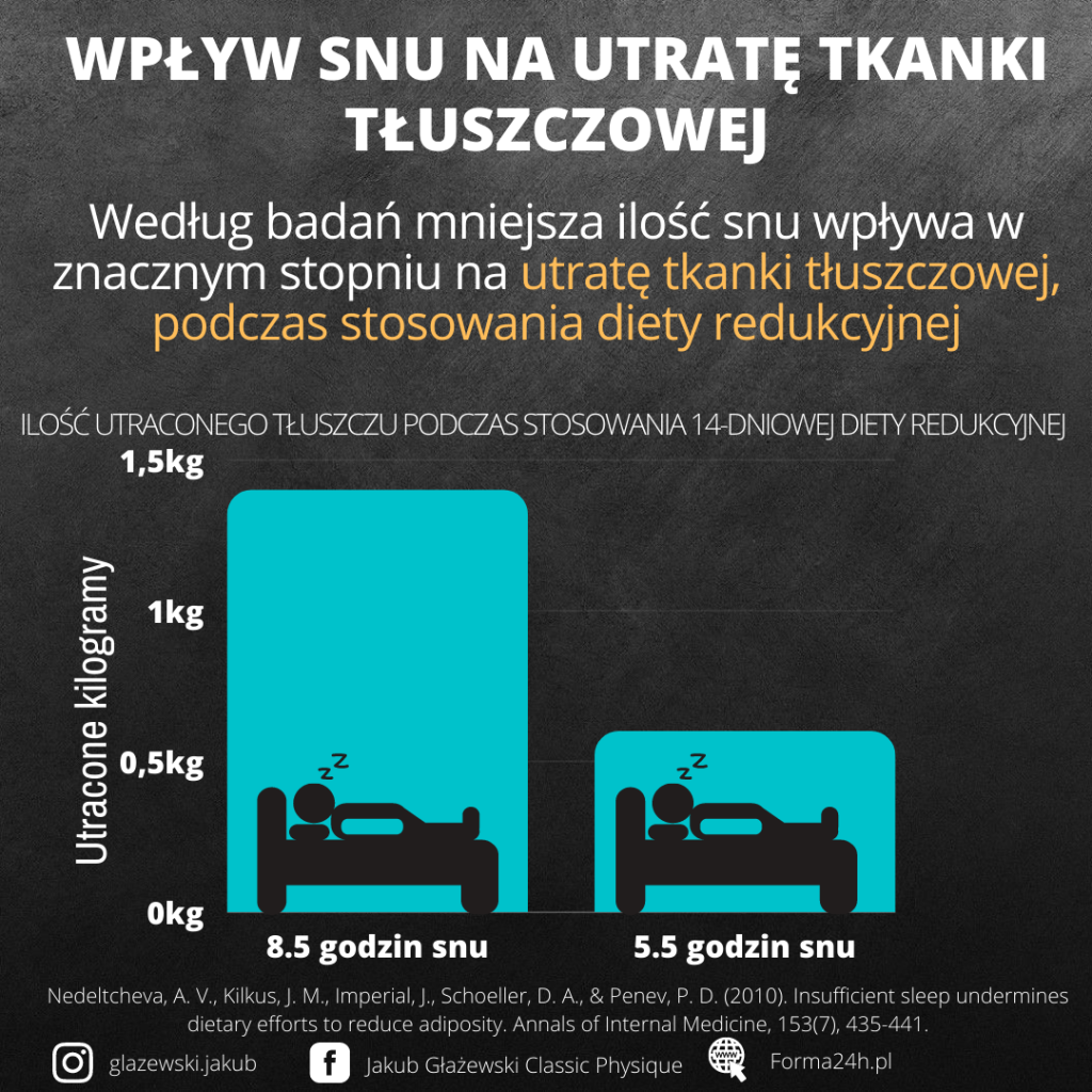 Jeśli zależy Ci na fajnej redukcji i ucinasz w tym celu spore ilość kalorii w diecie, a efekty są nadal mizerne to warto abyś również zadbał o prawidłowy sen. Poza aspektem utraty większej ilości tłuszczu, również pomoże ci to w trzymaniu prawidłowej diety bez podjadania poprzez odpowiednią regulację hormonów głodu i sytości. Osobiście rekomenduje od 7,5h do 9h snu podczas doby. Zdaję sobie sprawę że w tych czasach, bardzo ciężko o 9h snu, ale czego się nie robi dla lepszej sylwetki i samopoczucia.